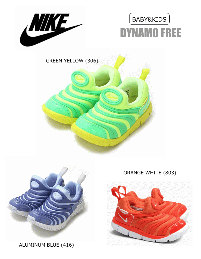 ナイキのファーストシューズ! 口コミで人気第一位の「ダイナモフリー」 非常に柔軟性、屈曲性に優れ、とにかく脱ぎ履き楽々 のスリッポン お子様の足をカラフルに彩ること間違いなし! ストレッチに優れたアッパーは、お子様の足に 履かせるのにも楽々♪